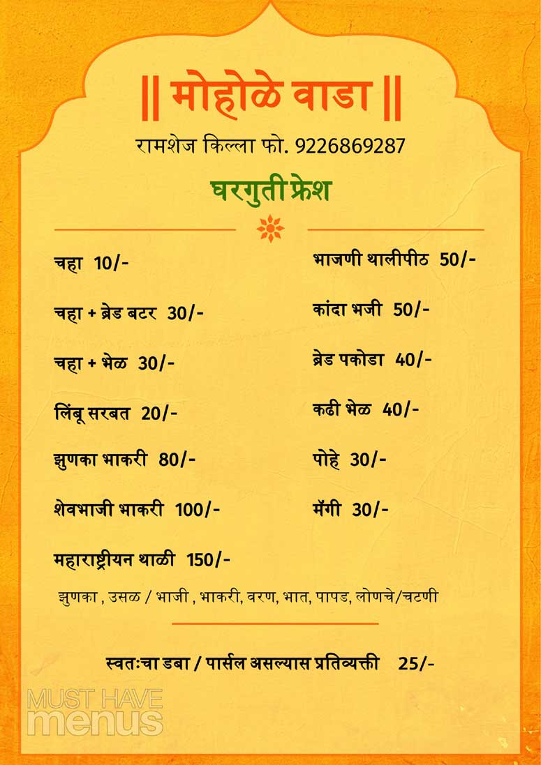 महाराष्ट्रीयन थाळी, झुणका / शेवभाजी भाकरी, भाजणी थालीपीठ, कांदा भजी, कढी भेळ अशा पारंपारिक शुध्द शाकाहारी पदार्थाचा मनमुराद आस्वाद घ्या